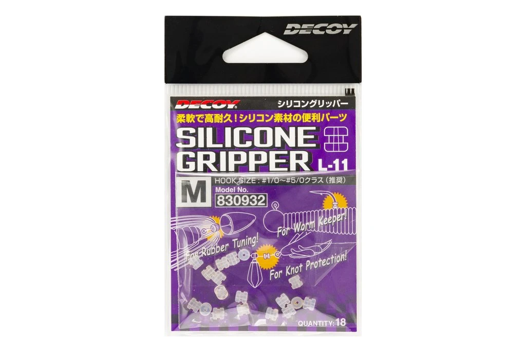 Decoy’s new Silicone Gripper L-11 is a versatile rig part made with silicone. You can hook through or line through in the middle; can be used as knot protector, sinker cushion and worm holder . Also, by utilizing center slit, you can wrap around rubber skirt and make attachable skirt part.