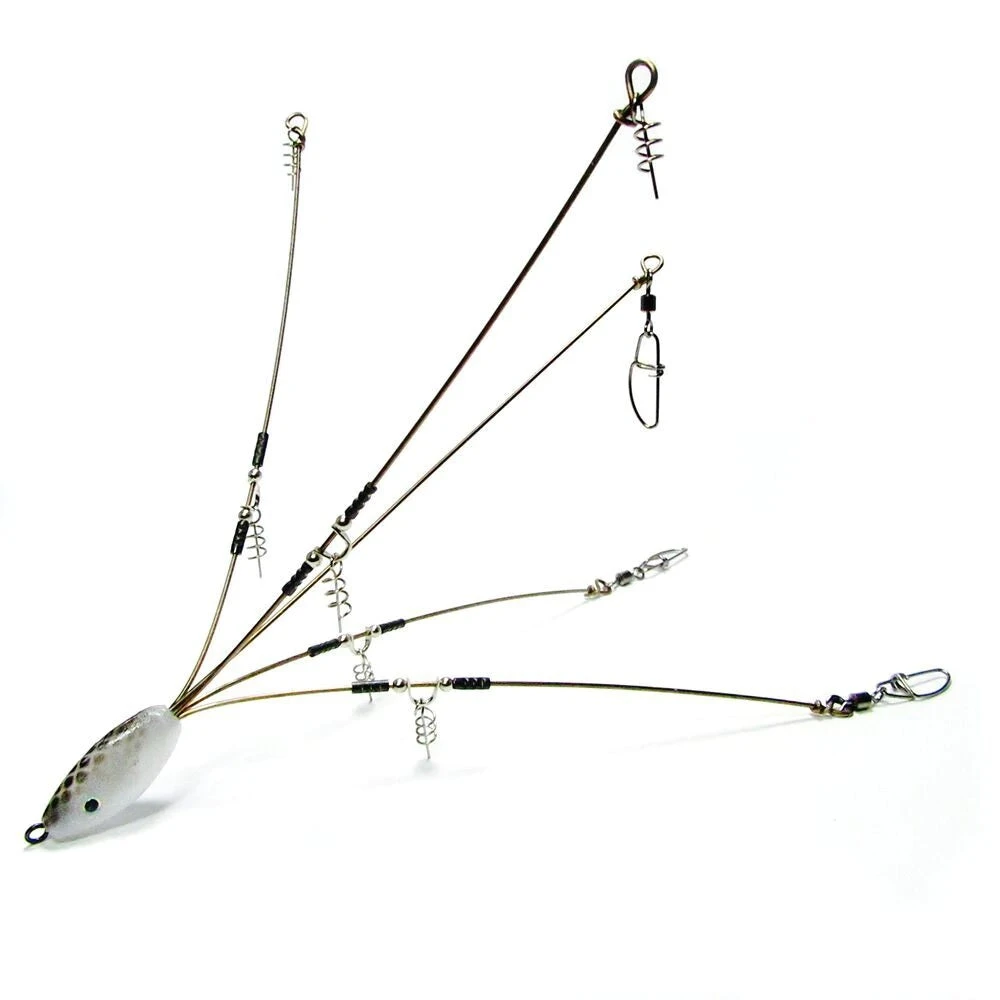 Designed to give your umbrella rig presentation a burst of life, the HogFarmer Baits Flex Rigs allow your swimbaits to react quicker and produce an action that perfectly mimics a panicked school of baitfish. Built using .035” wire that is thinner than standard HogFarmer umbrella rigs, HogFarmer Baits Flex Rigs pulsate and contract when anglers impart short twitches with the rod tip or quick turns with the reel handle, which forces the entire rig to flex and give the appearance of a baitfish school trying to flee from predators. An impact-resistant plastic head with a built-in swivel provides increased durability and eliminates line twists as well. Simply add your favorite jigheads and swimbaits!