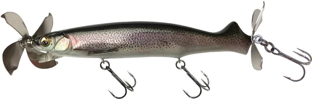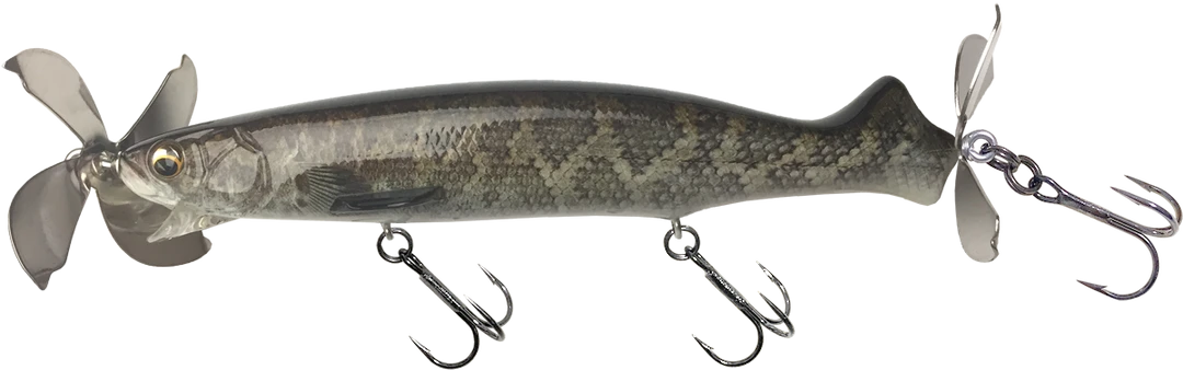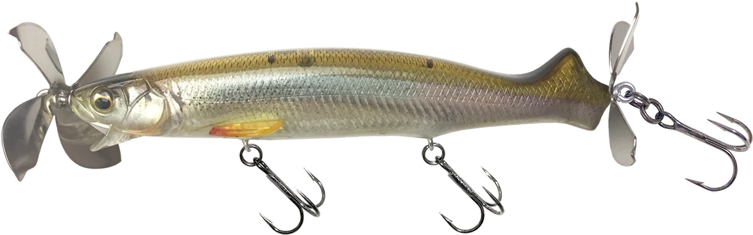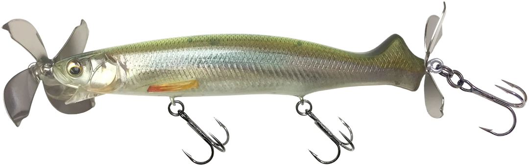 The Imakatsu Dead Screw is a large 4-piece prop that breaks the conventional wisdom of what topwater prop baits should be. A square center hole generate a dead slow retrieve similar to a crawler bait and a complicated metal scratch sound. The two front and rear four-blade props, which are different in size, are different from conventional props, and due to their unique shape and weight, they produce a unique