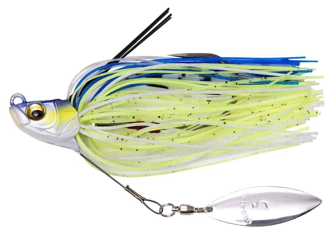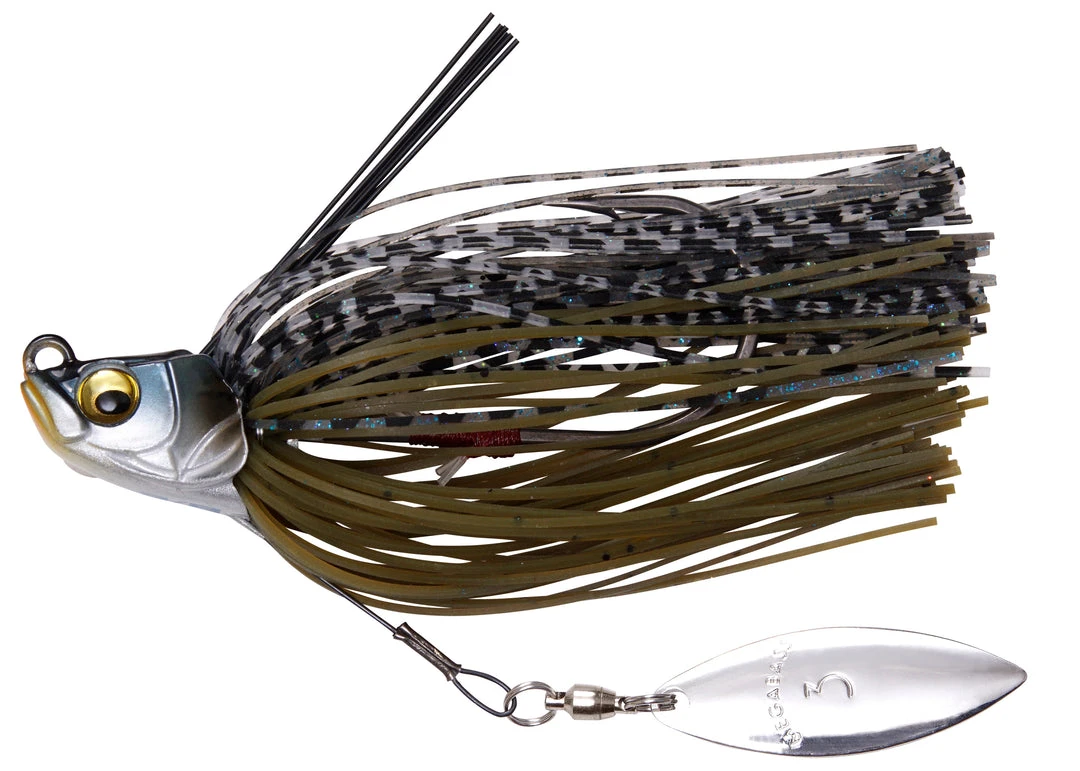 Megabass set out to create the finest swim jig on the market, and the result is the Uoze Swimmer! ย The Uoze Swimmer features a custom shaped head designed to hold a paddle tail swimbait like a spark shad or Keitech. ย The head aides the jig in wobbling side to side subtly. ย Below the head is a titanium wire and willow leaf blade, giving the jig an underspin look for extra attraction. ย A cutting point hook, dual hand tied bait keepers and a wire tied skirt round out the hand crafted performance that is the Uoze Swimmer.