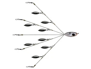 The Picasso Flash Back is built with a 2-tier blade configuration consisting of eight #1 willow blades that imitates the shiny “flickering” commonly seen in baitfish schools. Constructed with low visibility brown wire that allows the fish to focus on the baits being presented instead of the distraction of flashy wires. The lightweight high- impact resistant plastic head and embedded nose swivel prevents line twist and also prevents the fish from leveraging itself off when hooked. No longer does a broken swivel render your Umbrella Rig useless and destined for the trash along with your hard earned money. Features the markets only SLIDING SLEEVE that allows for quick and easy replacement of any damaged or worn terminal swivels. This can be particularly critical during tournament situations when rigging up an entirely new Umbrella Rig can take up much needed time. Equipped with premium American made components including a 140lb strength nose swivel, and heavy duty terminal snap swivels of 75 lb strength to keep your swim baits secure and to assure landing the doubles and even triples that this rig commonly catches. This is a very versatile size than can be used for targeting suspended fish or throwing around docks, blow downs or other structure.